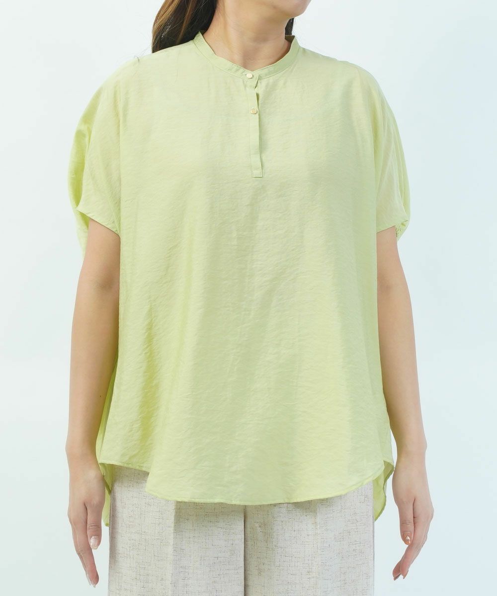 ネック周りはバンドカラー仕立てでスッキリ見えに。