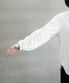 舟形のヘムラインはパンツスタイルにも好相性です。