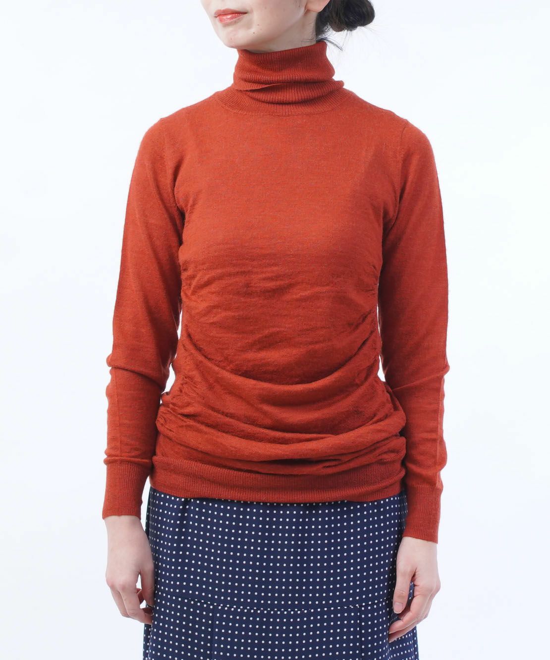 サイドに切り替えが入ったギャザーデザインが表情のあるタートルニット。