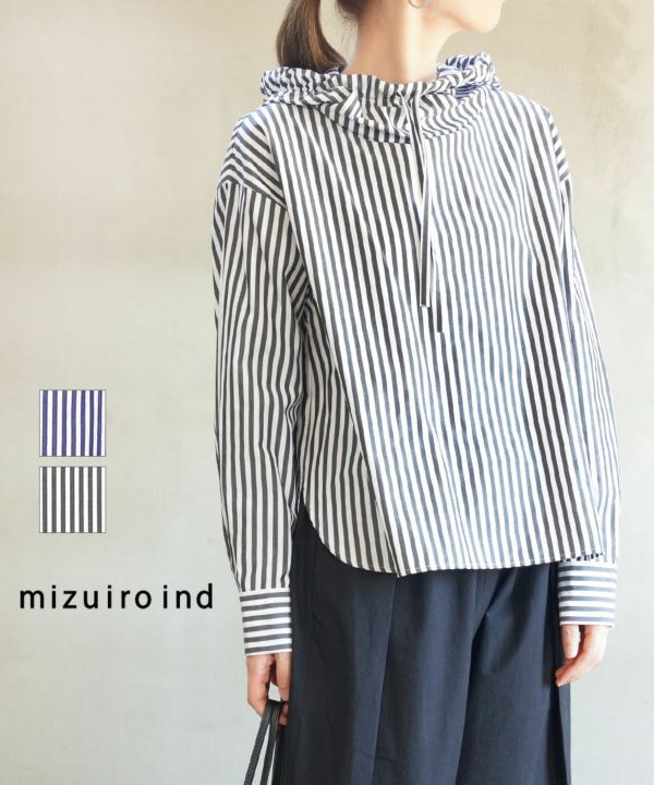 mizuiro ind(ミズイロインド)の「ストライプフーデッドシャツ」。