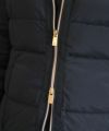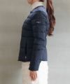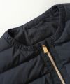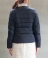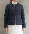 ノーカラーで襟元のギャザーが特徴のショート丈ダウンジャケット。