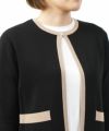 襟ぐりとフロントライン、ポケットの上部分を飾るバイカラーのトリミングには