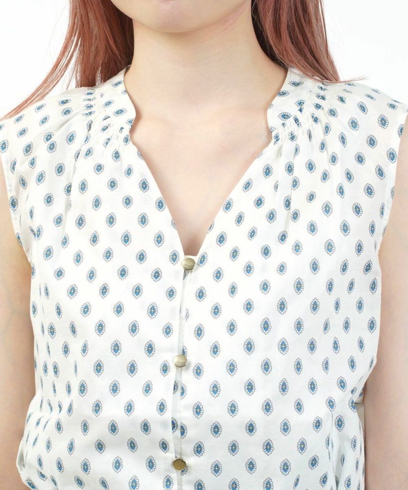 コットンローン プロヴァンス風幾何プリントノースリーブブラウス