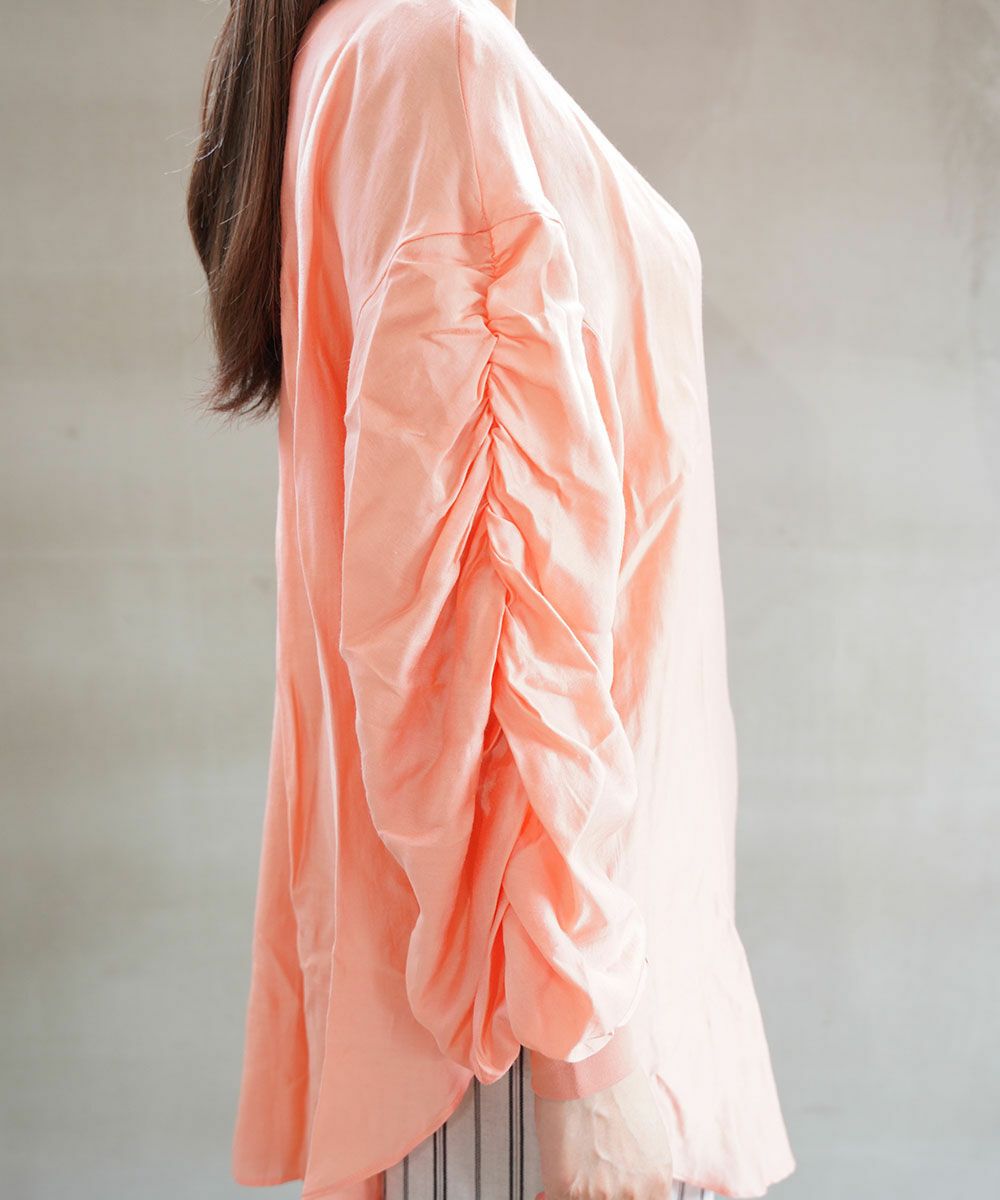 袖部分には大胆なシャーリングを施しました。