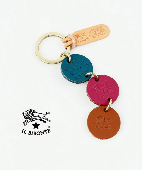 バッファローロゴが刻印されたレザータグを連ねるキーリング。