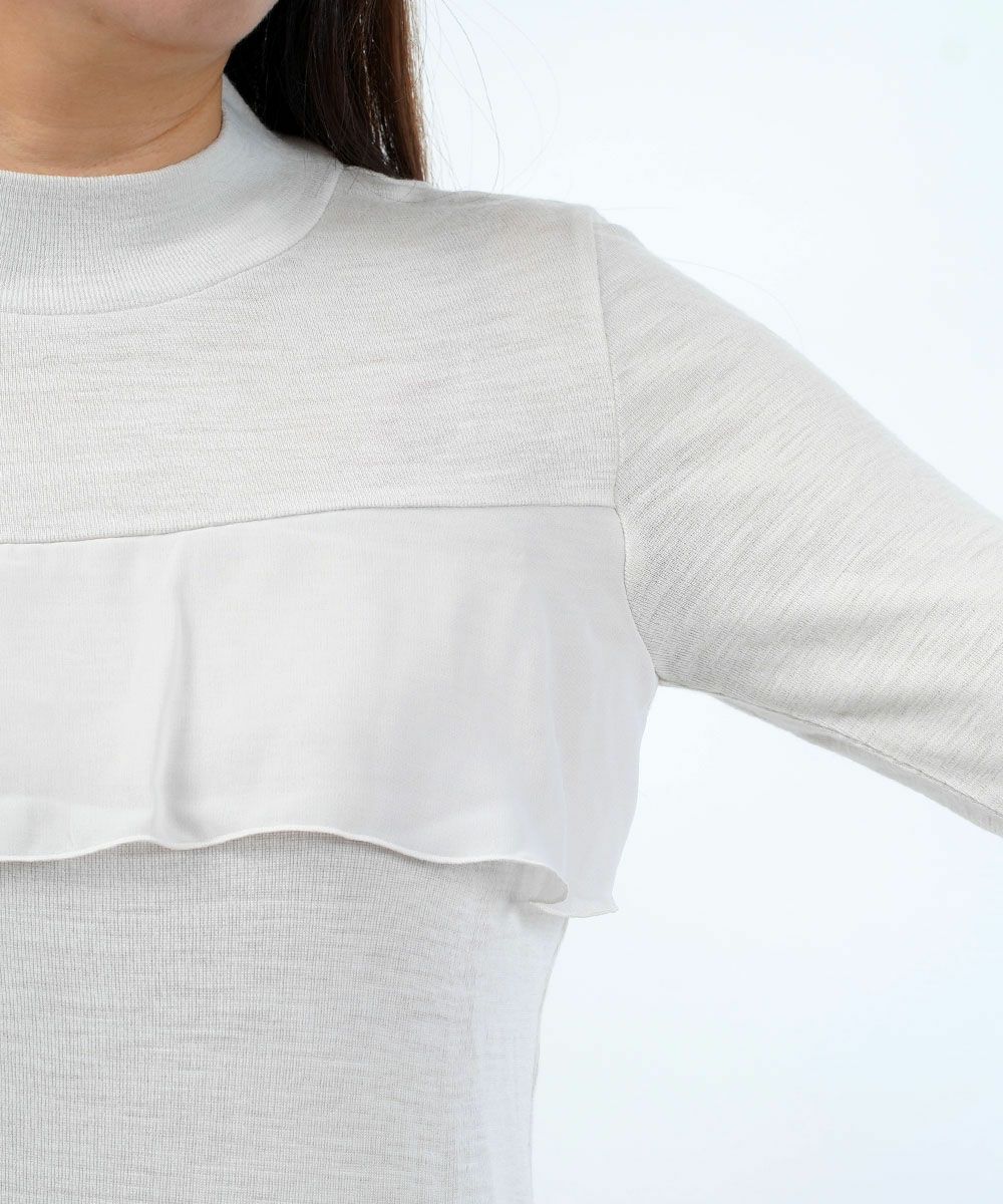 前身頃から右脇にかけてあしらわれたアシンメトリーなフリルデザインがポイントになって、