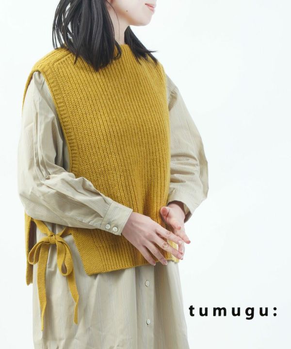 tumugu(ツムグ)ウールアルパカ片畦ニット サイドリボンベスト