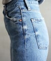 ウエストのくびれを強調するような深い股上と、ストレートなワイドレッグが特徴。