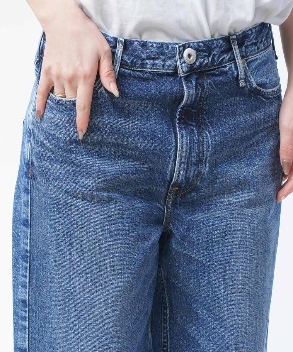 デニムの色落ち加工にこだわりヴィンテージムードを高めた、ややヒップ周りに丸みのあるテーパードシルエット。