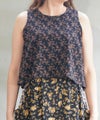 トップスとスカート部分の柄を大胆に切替えたレイヤード風デザインです。
